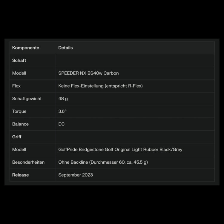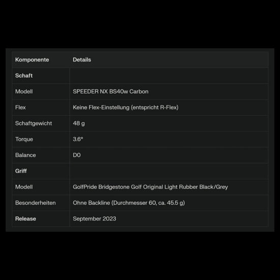 - SPEEDER NX BS40i : Lightweight shaft (40 g) with high stability that suppresses impact and pushes the ball forward powerfully. Supports an automatic swing.