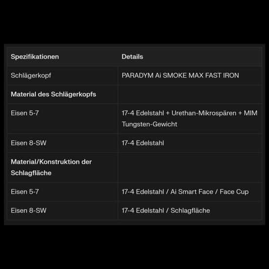 - Various shafts to choose from: The "PARADYM Ai SMOKE MAX FAST Iron" model range includes irons 5 to 9, PW, AW, GW and SW. The Ai Smart Face is installed in irons 5 to 7, which are designed for good flight characteristics but also for more frequent mishits. A face is used in the subsequent irons. Callaway's unique urethane microspheres, which provide excellent feel, as well as tungsten weights for optimal weight distribution, are also integrated in irons 5 to 7. The loft angle is relatively strong and is 26 degrees for the 7 iron. The shafts are available in two steel tones and one carbon type, with two of the steel tones and the carbon type being lighter than the PARADYM Ai SMOKE Iron and PARADYM Ai SMOKE HL Iron. This, together with the lightweight head, enables a high swing speed.